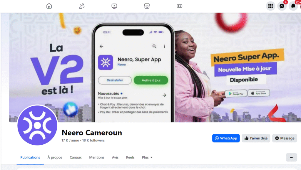 Et n’oubliez pas, si vous prévoyez de lancer des publicités Facebook pour booster votre page, pensez à utiliser la carte VISA virtuelle Neero pour vos paiements publicitaires. Elle est gratuite, sécurisée, et vous offre jusqu’à 500 FCFA de cashback à chaque transaction.